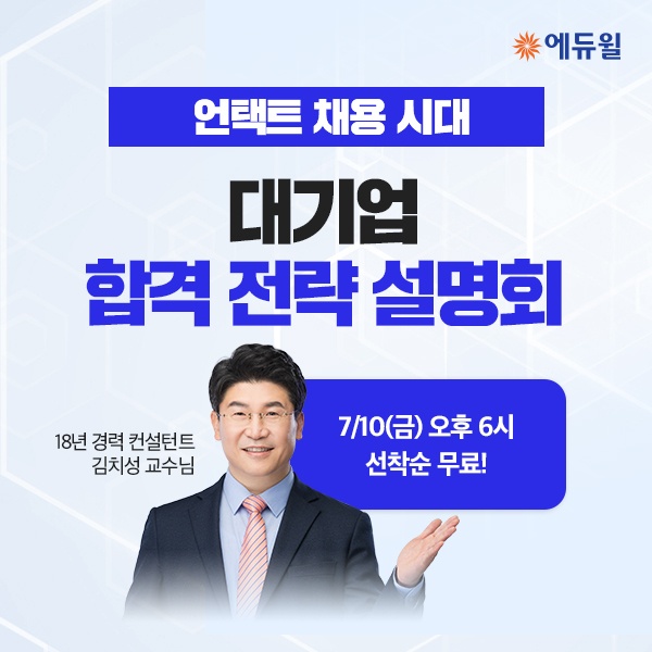 에듀윌은 10일 18시부터 대기업 채용 대비 ‘취업순삭 설명회’를 진행한다. ‘언택트 채용 시대, 대기업 면접 방식 변화와 취업 준비생 전략’을 주제로 개최되는 설명회로 18년 경력 컨설턴트 전문 교수가 취업 전략에 대한 노하우를 공개할 예정이다. 참석자 전원에게 푸짐한 에듀윌 굿즈를 제공한다. 사전 신청시 스타벅스 커피를 추가로 받을 수 있다.