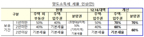 양도 소득세율도 대폭 높였다. 2년 미만 단기 보유 주택에 대한 양도 소득세율을 인상했다. 1년 미만 주택은 현행 40%에서 70%로, 2년 미만 주택은 기본세율에서 60%로 올렸다.