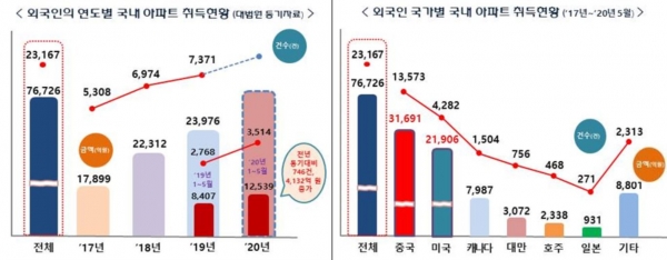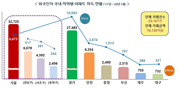 국내 집값이 고공행진하는 가운데, 외국인까지 부동산 시장에 뛰어 들고 있다. 3일 국세청에 따르면 올해 1~5월 외국인의 국내 부동산 거래금액은 1조2539억원, 거래량은 3514건으로 전년보다 각각 49.1%, 26.9% 올랐다. 지난 2017년부터 올해 5월까지 약 2만3219명의 외국인이 7조6726억원 상당의 국내 아파트 2만3167채를 취득한 것으로 알려졌다.