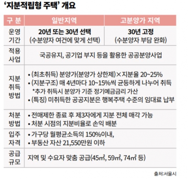 공공분양의 구체적 공급방식은 지역별 수요·여건 등에 따라 지자체가 결정할 수 있도록 자율권을 부여할 방침이지만, 지분적립형 분양이 공공분양 형태가 될 가능성이 크다.