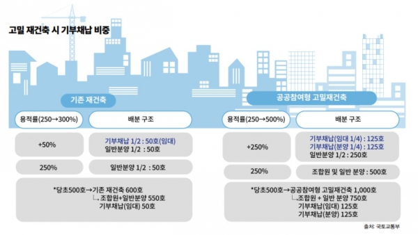 공공재건축 등을 통해 기부채납 받은 주택은 크게 두 가지로 형태로 공급된다. 우선 장기 ‘공공임대’의 형태로 공급하는 방식이다. 두 번째는 청년·신혼부부를 위한 ‘공공분양’ 방식이다. 다만 전체 공급량의 50% 이상은 장기 공공임대 등 임대주택 형태로 공급된다. 공공분양 등 이른바 자가 마련을 위한 공급량은 더욱 희소할 것으로 보인다.