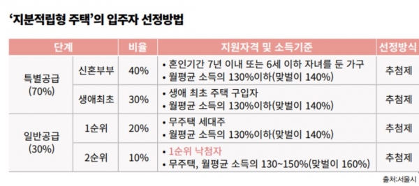 서울시 등에 따르면 입주자 선정 요건을 위한 소득 기준은 가구당 월평균 소득의 150% 이내면 된다. 올해 1분기 기준 통계청을 보면 대략 월 가구 소득이 800만원 이내여야 한다. 부동산 자산 2억1550만원 이하, 자동차 2764만원 이하 등 조건을 충족하면 신청 가능하며 전원 추첨을 통해 선정할 것으로 예상된다. 입주자 선정 비중은 신혼부부가 40%, 생애 최초 주택구입의 경우 30% 등 특별공급 70%와 일반공급 30%로 배분된다. 오는 2028년까지 전체 1만7000여호가 공급될 전망이다.