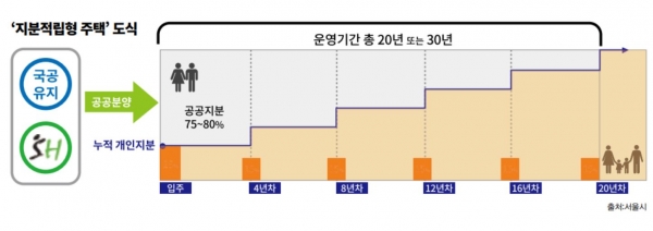 향후 지분매입규모를 늘려 20~30년에 걸쳐 임대료를 납입하고 전체 지분을 매입하는 형태다. 기존 분양과 달리 모두 추첨제로, 청약조건이 완화돼 30·40세대에 보다 유리하다. 분양가의 20~40%를 부담하면 입주가 가능하다. 분양가가 9억원 이하인 경우 나머지 80~60%의 분양가는 20~30년간 분할 납부하면 된다. 9억원 이상이면 30년간 분할 납부하는 방식이다. 거주기간 동안 임대료는 납부해야 한다. 나머지 분양가 납입을 통해 주택 지분이 많아질수록 임대료는 줄어든다.