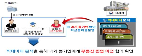 실제로, 체납법인의 대표인 체납자 A는 법인 체납에 대한 제2차 납세의무가 지정된 이후, 제3자 B에게 유일한 부동산을 양도하고 제2차 납세의무에 따른 체납이 발생했다. 국세청은 주민등록 변경 이력, 소득·지출 내역 등 빅데이터 분석으로 부동산 양수자인 B는 A의 과거 동거인이었으며, B의 소득 대비 부동산 취득자금이 부족한 점을 확인했다. A와 B의 금융거래내역 확인 및 체납자 거주지 수색 등 추적조사를 실시해 부동산을 허위 매매한 사실이 확인되는 경우, 사해행위 취소소송을 통해 체납세금을 징수하고 A와 과거 동거인이었던 B(방조범)를 체납처분 면탈범으로 검찰에 고발하는 등 체납처분회피 행위에 엄정 대응할 예정이다.