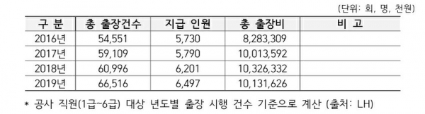 2016년부터 2019년까지 LH임직원의 총 출장건수와 출장비 지급액은 지속적으로 증가하고 있다.