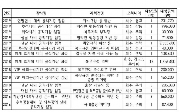 LH감사실이 최근 5년간 출장비 부정수급 건으로 징계 조치를 내린 경우는 14건(34명 대상, 회수 767만6570원)에 불과했다. LH '여비규정'에는 출장비(여비) 등에 대한 환수 및 징계를 별도로 규정하고 있지 않다. 다만 감사 결과에 따라 환수가 이뤄지며, 징계가 필요한 경우 '인사규정'에 따라 조치하고 있다.