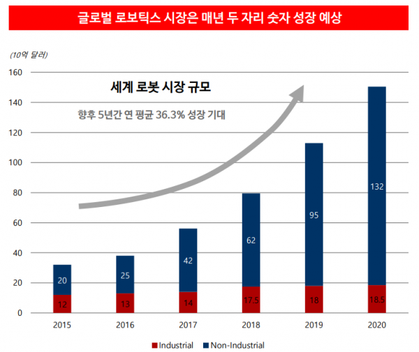 특히 로보틱스에 기반한 로봇산업은 안전과 편리성, 생산성을 높이며 인간의 삶의 질을 향상시키고 있으며 인공지능, 정보, 전자, 기계, 소프트웨어, 반도체 등 미래 혁신기술이 총망라된 복합 결정체로 미래 성장성이 매우 높은 것으로 평가된다.
