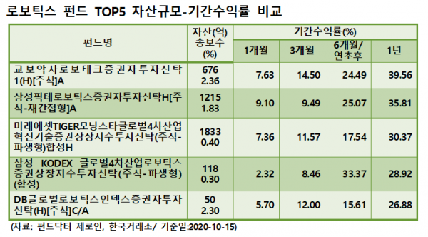 펀드닥터 제로인에 따르면 지난 15일 현재 로봇산업과 로봇 관련 기술 보유기업에 투자하는 로봇펀드 상위 TOP5의 1년 평균수익률은 32.30%로 매우 양호한 실적을 거두고 있다.