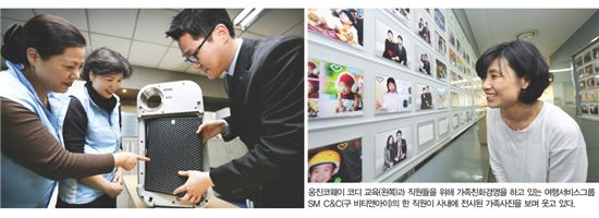 여행서비스 그룹인 SM C&C(구 비티앤아이)는 여성인력이 70% 이상인 그룹으로 구성원들의 일·가정 양립을 위해 가족친화경영을 펼쳐왔다. ‘고객은 VIP, 직원은 VVIP’를 경영이념으로 삼고 출산 및 육아를 위해 근무시간을 조정하고 육아기 단축근무제 등을 시행했다.