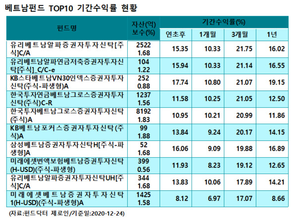 개별 상품별 수익률을 살펴보면 베트남펀드 중 최근 3개월 수익률에서 가장 높은 수익률을 기록한 상품은 유리베트남알파증권자투자신탁[주식]C/A 펀드로 21.75%를 기록하며 1위를 차지했다. KB스타베트남VN30인덱스증권자투자신탁(주식-파생형)A 펀드는 21.07%를 기록하며 3위에 올랐다. 이어서 한국투자연금베트남그로스증권자투자신탁(주식)C-R은 21.05%, 한국투자베트남그로스증권자투자신탁(주식)A는 20.99%, KB베트남포커스증권자투자신탁(주식)A는 20.17%, 삼성베트남증권자투자신탁H[주식-파생형]A는 19.88%, 미래에셋변액보험베트남증권투자신탁(H-USD)(주식-파생형)은 19.12%, 유리베트남알파증권자투자신탁UH[주식]C/A는 17.89%, 미래에셋베트남증권자투자신탁 1(H-USD)(주식-파생형)A 펀드는 17.07%를 기록하며 각각 4~10위를 차지했다. 베트남펀드 TOP10의 3개월 평균수익률은 20.01%를 기록했다.