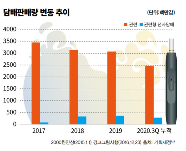 전세계를 덮친 코로나19는 궐련형전자담배시장에도 영향을 미쳤다. 하지만 '적신호'보단 '청신호'였다. 지난해 하반기부터 시장 상황이 반전됐기 때문이다. 기획재정부에 따르면 2020년 1~3분기 담배 판매량은 27억5000만갑으로 전년 동기 26억갑 대비 5.6% 증가했다. 이는 2016년 이후 최대치다. 궐련형 전자담배 판매량도 증가했다. 담배 한 개비로 '코로나 블루'를 달랜 사람들이 늘어난 덕분이란 평가가 지배적이다.