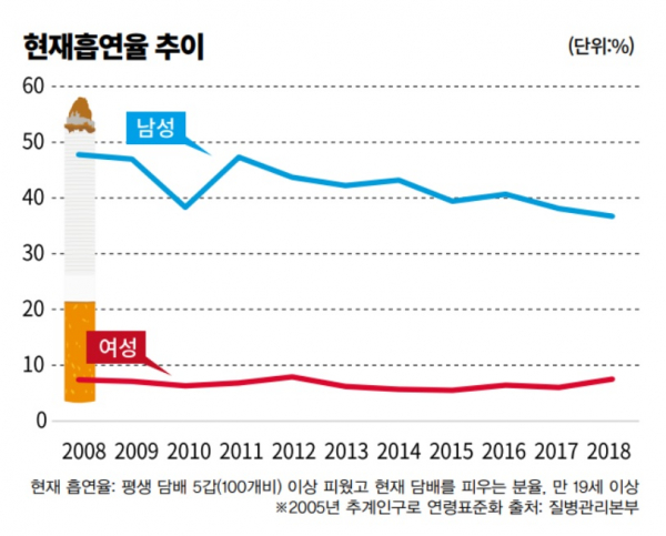 여기에 가격 인상(2015년)에 더해 더 강력한 담뱃갑 경고그림(2016년 12월)까지 등장하면서 지속적으로 하락해왔다. 질병관리본부에 따르면 국내 흡연율 역시 지난 1998년 이후 점차 하락해 2014년 24.2%로 떨어졌고, 2015년 1월 담뱃값 2000원 인상 영향으로 22.6%까지 떨어졌다. 이후 2016년 들어 23.9%로 반등했지만, 다시 감소하면서 2018년 흡연율이 역대 최저치를 기록한다.