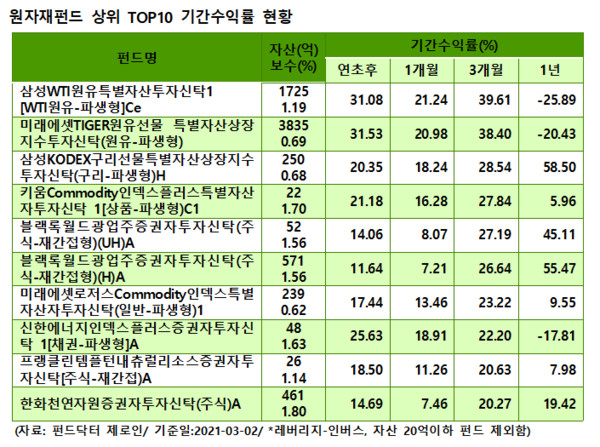 원자재 펀드는 원유, 구리, 금 등 실물자산에 투자하는 상품으로, 지난해 코로나19 팬데믹(세계적 대유행) 확산으로 유가가 폭락하며 마이너스 실적을 올린 상품이 대부분이다.