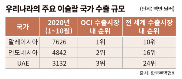 정부도 할랄 시장에 진출하는 우리 농식품 수출기업을 지원하기 위해 할랄식품육성사업에 매년 평균 14억원의 예산을 투입하고 있지만 수출실적은 꾸준히 감소하고 있다. 농림축산식품부에 따르면 2017년부터 2019년까지 이슬람국가 수출 금액은 10억366만 달러에서 6억8,385만 달러로 32%나 감소했고, 수출 중량도 46만734톤에서 41만3,740톤으로 10% 감소했다.