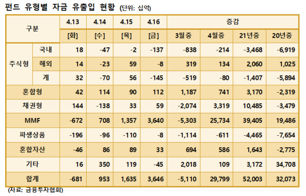 지난해 2020년 연중 자금 흐름과 비교하면 주식형 펀드는 연간 5조8,940억원이 감소했지만, 채권형 펀드는 비교적 감소 폭이 적은 3조4,790억원 줄었다.