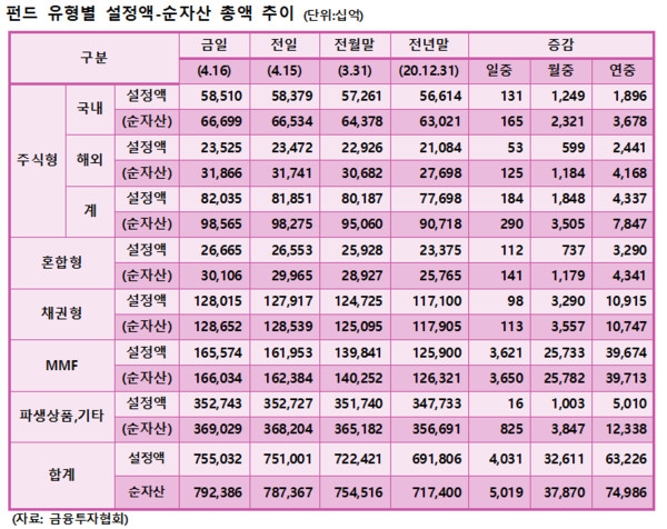 금융투자협회의 ‘펀드 유형별 설정액-순자산 총액 추이’에 따르면 지난 16일 기준 주식형 펀드의 연중 설정액은 82조350억원으로 연중 4조3,370억원이 증가했다. 순자산은 98조5,650억원으로 연중 7조8,470억원이 증가한 것으로 파악됐다.