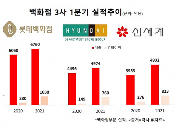 앞서 실적을 발표한 롯데백화점(롯데쇼핑, 023530)과 현대백화점(069960)도 눈부신 성장을 보였다. 올 1분기 롯데백화점의 매출은 6,760억 원, 영업이익은 1,030억 원으로 전년 동기 대비 각각 11.5%, 261.3% 올랐고, 영업이익은 760억 원으로 2배 이상(122.3%) 뛰었다. 현대백화점 역시 올 2월 오픈한 더현대서울과 지난해 오픈한 아울렛 두 곳 등 신규 개점 효과로 백화점 실적이 크게 늘었다. 현대백화점은 1분기 매출이 4,974억원, 영업이익은 760억원으로 각각 26.7%, 122.3% 증가했다.