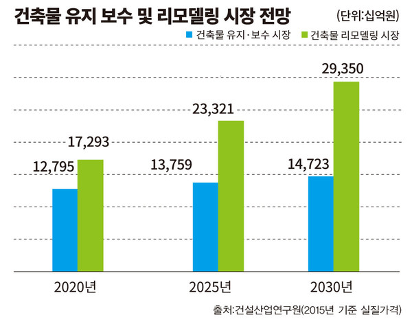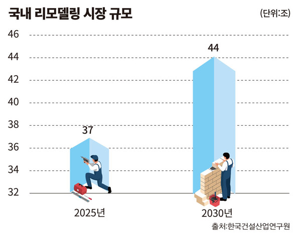 리모델링 시장 규모가 점차 증가하고 있다. 한국건설산업연구원에 따르면, 국내 리모델링 시장 규모는 오는 2025년 37조원 이상, 2030년이면 44조원에 달할 것으로 전망하고 있다. 건축물 전체 리모델링 시장으로 범위를 넓혀보면, 아파트 리모델링이 차지하는 비율은 지난 2010년 0.01%, 주거 0.2% 규모에서 2019년 전체 0.5%, 주거 14.7% 확대됐다. 이 기간 동안 전체 리모델링 착공면적은 연평균 1.7% 증가에 그쳤지만, 아파트 리모델링은 57.5% 급증했다.
