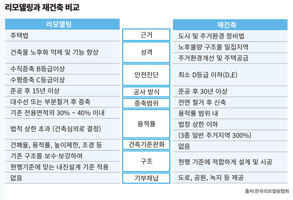 재건축은 28~30개월, 리모델링은 23~26개월이 소요되는데, 리모델링으로 사업시 공사기간을 약 4개월 정도 단축할 수 있다는 계산이 나온다. 또 리모델링은 일반 분양 물량은 기존 가구수의 15% 이내, 3개 층까지 수직 증축이 가능하고, 재건축은 용적률 범위 내에서 가구수에 제한이 없다. 안전진단의 경우, 재건축은 최소 D등급 이하, 리모델링은 수직증축B등급 이상·수평증축C등급 이상이어야 한다.