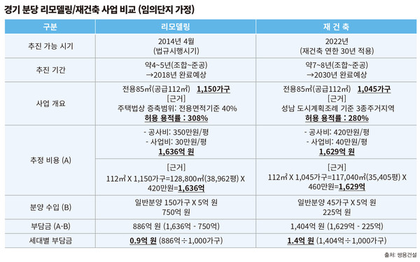 실제 한 건설사의 도움을 서울 인기 지역인 강남과 현재 1기 신도시로 리모델링 붐이 한창인 분당의 한 단지를 시뮬레이션 했다. 다만, 자료는 2014년 기준으로 해당 단지의 시세 차이는 발생할 수 있다. 기타 설계와 법규, 인허가 등 유동적인 요소 및 개발부담금, 기부채납, 인센티브 등은 반영이 안됐다. 분당의 경우, 편의상 리모델링 및 재건축 후 평형은 단일평형으로 동일하게 산정했다.