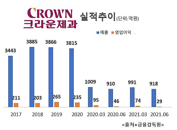 금융감독원에 따르면 크라운제과는 올해 2·4분기 매출이 918억원으로 지난해 같은 기간 보다 0.88% 성장하는데 그쳤고, 같은 기간 영업이익은 29억원을 기록하며 37% 뒷걸음질쳤다. 이는 1·4분기에도 마찬가지였다. 이 기간 크라운제과는 매출과 영업이익 모두 0.18%, 22.1% 하락했다.