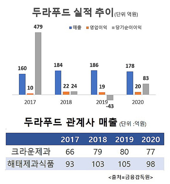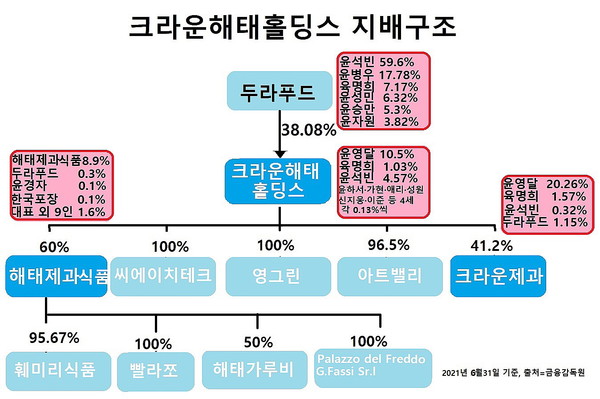 단독 사령탑에 오른 것은 다소 늦었지만 윤 대표는 크라운해태그룹을 거머쥔 실질적 소유주다. 크라운해태그룹은 '두라푸드→크라운해태홀딩스→해태제과식품·크라운제과'로 이어지는데 그룹 최정점에 선 비상장사 두라푸드는 최대주주가 지분 59.6%를 보유한 윤 대표이기 때문이다. 두라푸드는 매출 대부분이 크라운제과와 해태제과식품과의 거래와 배당금수익을 통해 이뤄진다. 지난해 두라푸드 매출 178억원 중 양사로부터 거둬들인 금액은 175억원에 달했다.