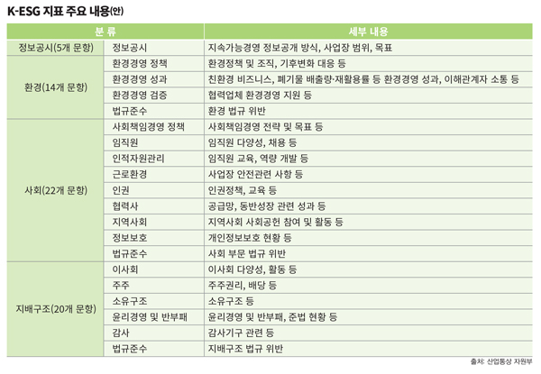 이미 정부는 지난해부터 ‘산업발전법’에 근거한 가이드라인 성격의 ESG 지표를 준비·마련해 왔고, 지난 4월 21일 ‘K-ESG 지표 업계 간담회’를 통해 지표 초안을 공개했다. 세부 내용을 살펴보면, ▲정보공시(지속가능경영 정보공개방식, 시업장 범위, 목표) ▲사회분야에서는 사회책임 경영 정책(사회책임경영 전략 및 목표), 임직원(임직원 다양성, 채용), 인적자원관리(임직원 교육, 역량개발), 근로환경(사업장 안전관련 사항), 인권(인권정책, 교육), 협력사(공급망, 동반성장 관련 성과), 지역사회(지역사회 사회공헌 참여 및 활동), 정보보호(개인정보보호 현황), 법규준수(사회부문 법규 위반) ▲환경분야의 경우 환경경영 정책(환경정책 및 조직, 기후변화 대응), 환경경영 성과(친환경 비즈니스, 폐기물 배출량·재활용률), 환경경영 검증(협력업체 환경경영 지원), 법규준수(환경 법규 위반) ▲지배구조에 있어서는 이사회(이사회 다양성, 활동), 주주(주주권리, 배당), 소유구조, 윤리경영 및 반부패(윤리경영 및 반부패, 준법현황), 감사(감사기구 관련), 법규준수(지배구조 법규 위반) 등이다.
