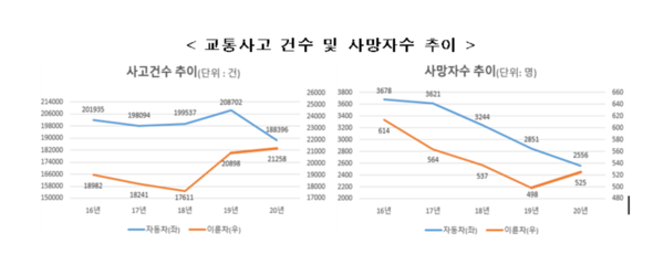 국토교통부는 국무총리 주재로 열린 국정현안점검조정회의에서 이같은 내용을 담은 '이륜자동차 관리제도 개선방안'을 확정했다고 2일 발표했다. 이는 우리나라 자동차 사고건수는 계속 줄고 있지만 코로나 19로 인해 이륜차 배달대행 서비스가 늘면서 이륜차 사고건수와 사망자 수는 오히려 증가하고 있는데 따른 것이다. 2019년 2만 898건과 498명이던 오토바이 사고건수와 사망자수는 지난해에는 2만 1258건에 525명으로 늘었다.