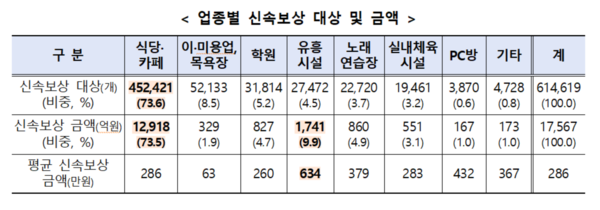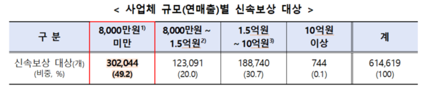 사업체 규모별 보상내용을 보면, 간이과세 대상에 해당하는 연매출 8,000만원 미만 영세 사업체가 30만곳으로 나타난 가운데 전체 신속보상 대상(62만곳)의 절반(49.2%)을 차지했다.연매출 1억5,000만원 이상에서 10억원에 해당하는 사업체는 전체의 30.7% 로 나타났다.