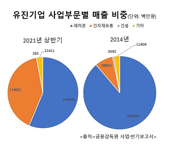 2일 금융감독원에 따르면 건자재유통 진출 첫해 115억원 수준이던 매출은 지난해 2,520억원까지 늘었다. 올해 상반기 매출은 1,741억원을 기록하며 전체 매출(4,276억원) 중 40.7%를 차지하고 있다. 이 추세대로라면 연내 3,000억원의 매출 달성이 무난할 것으로 전망된다.