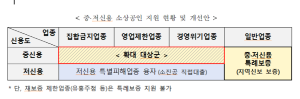 [이코노믹리뷰=세종 윤국열 기자]중·저신용 소상공인 특례보증의 지원대상이 중신용 집합금지·영업제한·경영위기 업종과 5인이상 소기업까지 확대된다.
