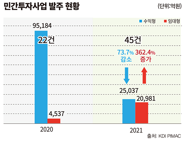 하지만 결과는 기대와 달랐다. 이들 프로젝트의 고시가 전부 미뤄지면서 2021년 발주 규모는 2020년 대비 반 토막 났다. 2020년 민자사업 고시 규모는 10조원에 다다른 9조9,721억원(수익형 사업 9조5,184억원ㆍ임대형 사업 4,537억원)이었다.