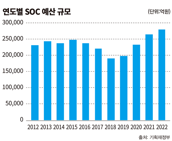 지난해 국회는 2022년 SOC 예산 규모를 전년 대비(26조5,000억원) 5.7% 증가한 28조원으로 의결했다. 역대 첫 28조원대다. 애초 정부는 올해 SOC 예산 규모를 27조5,000억원로 편성해 국회에 제출했다. 이를 심의하는 과정에서 국회는 2022년 SOC 예산 운용의 초점을 ▲수도권ㆍ지방 교통연결의 고도화 ▲SOC 디지털 관리 강화 ▲도시ㆍ물류 인프라 스마트화 ▲SOC 안전 등에 맞추고, 정부안보다 약 5,000억원 증액했다.