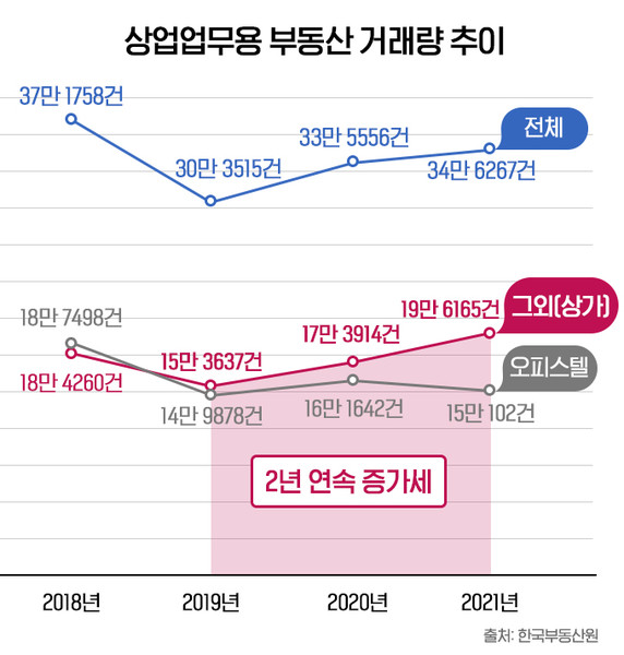 상업업무용 부동산은 2018년 37만1,758건을 기록한 후 이듬해 30만3,515건으로 거래가 줄었지만, 이후 2년 연속 상승세를 이어가고 있다.