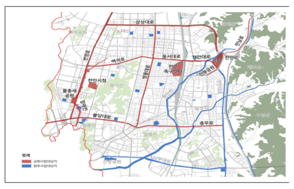 시는 천안IC와 만남로를 비롯해 시청앞광장, 물총새공원, 천안축구센터, 번영로 근린광장, 삼성대로, 번영로, 백석로, 동서대로, 불당대로, 충무로, 장재천 등 13개 구간을 선정했다.