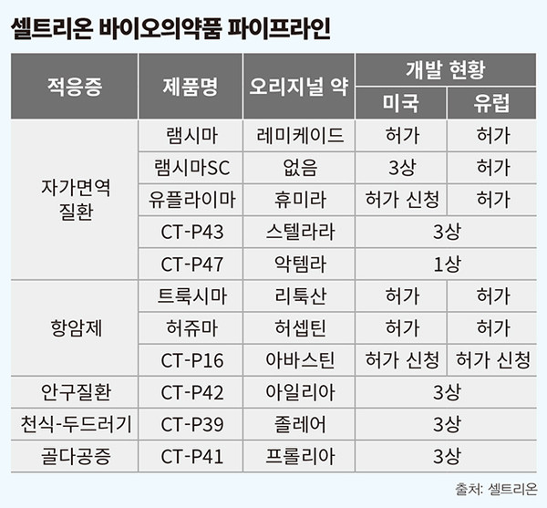 셀트리온은 2030년까지 해마다 1개 이상의 의약품 허가를 목표로 후속 파이프라인 개발에 속도를 내고 있다. ‘CT-P39(졸레어 바이오시밀러)’, ‘CT-P41(프롤리아 바이오시밀러)’, ‘CT- CT-P43(스텔라라 바이오시밀러)’의 글로벌 임상 3상을 진행하고 있으며 지난해 4분기에는 자가면역질환 치료제 ‘CT-P47(악템라 바이오시밀러)’ 임상 1상도 개시했다.