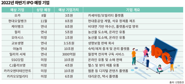 시장 환경은 아직 녹록치 않으나, 상반기와 달리 하반기는 상장 이벤트 증가로 투자 다양성은 확대될 것이다. 다만 상반기 LG에너지솔루션 케이스처럼, 쏘카, 현대오일뱅크 등 대형 IPO가 진행되는 경우 시중 유동성 쏠림으로 유통시장에 부정적 영향을 주는 경우가 있어 모니터링이 필요하다.