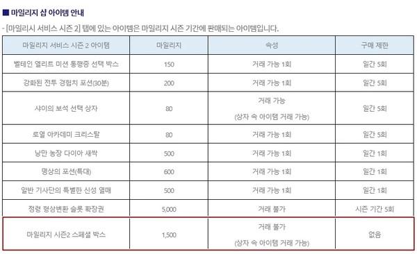 문제의 발단은 마비노기가 14일 공개한 ‘마일리지 시즌2 스페셜 박스(이하 스페셜 박스)’다. 아이템 샵에서 캐시아이템을 구매하면 금액의 2%를 마일리지로 돌려받는데, 게임 내 마일리지 샵에서 1500 마일리지를 지불하면 이 스페셜 박스를 하나 얻을 수 있었다. 박스 하나를 열려면 3만원이 필요한 셈이다.