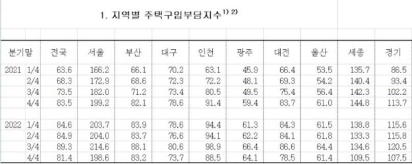 각 지수는 한국은행의 예금은행 주택담보대출 금리(신규 취급)와 한국부동산원 아파트 시세, 통계청 도시 근로자 가계소득과 고용노동부의 5인 이상 사업체 상용근로자 월 급여 총액 등을 이용해 산출했다.