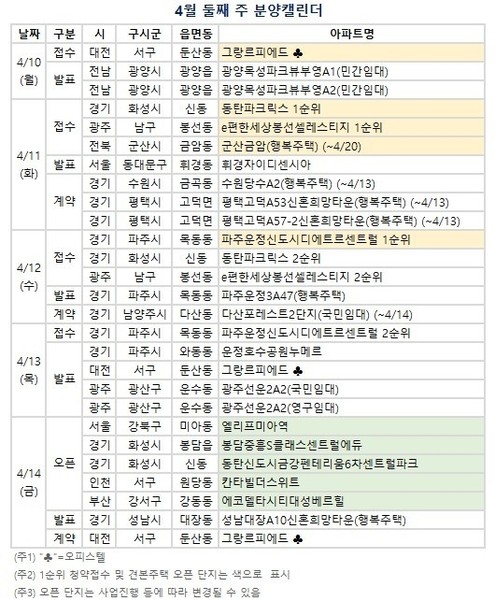 10일 부동산R114에 따르면 4월 둘째 주에는 전국 5개 단지에서 총 3476채를 분양한다. 이 중 일반분양은 1960채다. 11일엔 경기 화성시 신동에서 ‘동탄파크릭스’를 1순위 청약이 시작된다. 견본주택(모델하우스)은 서울 강북구 미아동 ‘엘리프미아역’, 경기 화성시 신동 ‘동탄신도시금강펜테리움6차’ 등 5곳에서 문을 연다.