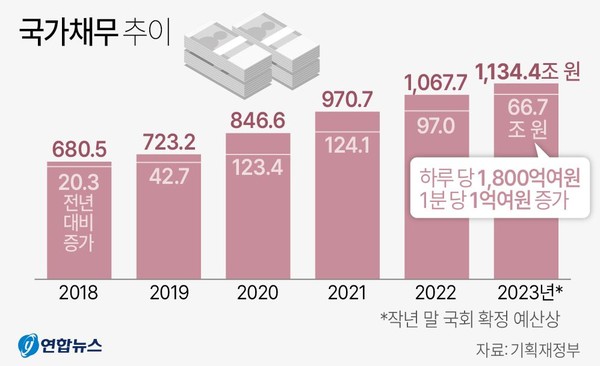 더 큰 문제는 그런 나라 빚이 쌓이기 시작하면서 국가경제 전체가 수렁으로 빠져들고 있다는 점이다. 지금도 국가채무는 1분에 1억2700만원씩 불어나고 있다. 남 얘기가 아니라 국민 모두가 지고 있는 등짐이 시시각각 무거워지고 있는 것이다. 국민들이 정신 똑바로 차려야 한다. 그래야 정치인들도 긴장하게 되고 나라도 바로 설 수 있다.