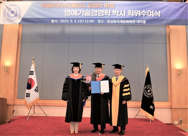 골프존뉴딘그룹 김영찬 회장이 지난 3 충남대학교 기술실용화융합학과에서 명예기술경영학 박사 학위를 받았다고 4일 밝혔다.