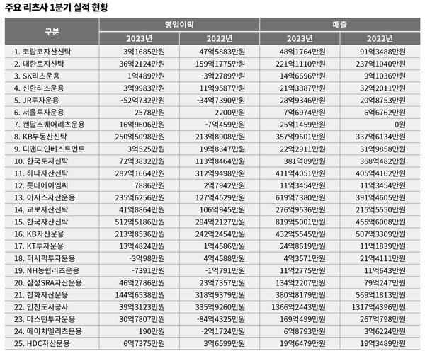 11개사 가운데 영업익이 가장 큰 비율로 준 기업은 인천도시공사(수탁액 7000억원)다. 지난 15일 인천도시공사가 국토부에 제출한 영업보고서에 따르면 회사의 영업익은 올 1분기 39억3123만원으로 전년 동기(335억 9260만원) 대비 88.3% 줄었다. 다만 인천도시공사는 앞서 2021년 5월 자산관리회사에 대한 설립 인가를 받았으나 대부분의 실적이 일반적인 리츠사들과 달리 자산 운용 위탁 수수료를 제외한 부문에서 발생하고 있다.