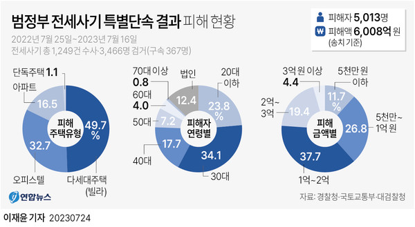 한편 경찰청은 국토교통부 대검찰청과 지난해 7월25일부터 이달 16일까지 약 1년간 벌인 전세사기 특별단속에서 의심사례 1천249건을 수사, 3466명을 검거하고 이 가운데 367명을 구속했다고 이날 밝혔다.