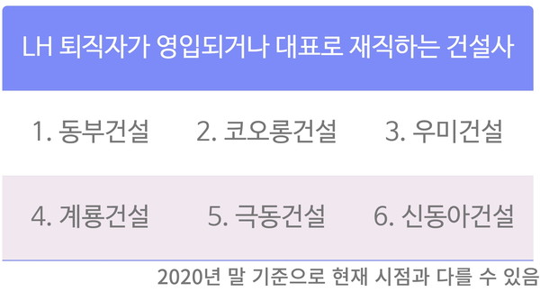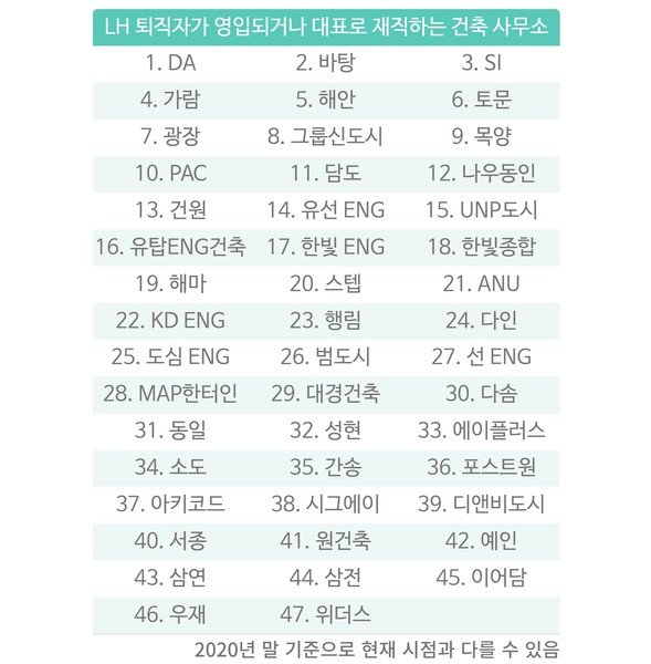 3일 경제정의실천시민연합(경실련)에 따르면 지난 2020년 기준 총 47곳의 건축 사무소(표 참조)와 6곳의 건설회사에 LH 퇴직자들이 근무중이거나 오랜 기간 대표 혹은 임원을 역임한 것으로 드러났다. (이하 근무업체와 근무자 현황은 2020년말 기준으로 현재와는 다소 차이가 있을 수 있음)