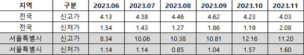 지난달 전국 아파트 신고가와 신저가 거래량이 급감한 것으로 나타났다. 높은 금리때문에 아파트에 대한 매매가 감소하고 있기 때문이다.