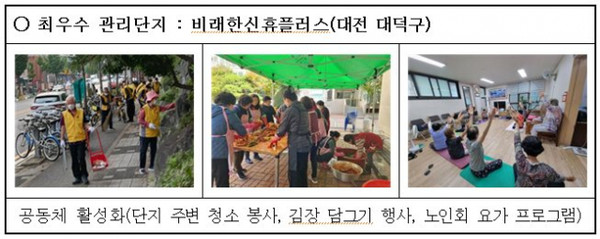 최우수 관리 단지엔 대전 대덕구 비래한신휴플러스(646채)가 뽑혔다. 주민 화합 행사와 고령 친화 프로그램으로 공동체 활성화 분야에서 높은 점수를 받았다.