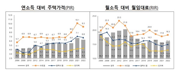 이번 조사 결과 지난해 자가소유주의 가구 연 평균 소득 대비 주택가격 배수(PIR)는 전국 평균값이 6.3배(중위수 기준)로 집계됐다. 이는 전년도 조사 때의 6.7배에 비해 소폭 낮아진 것이다. PIR는 받은 월급을 모두 모아 집을 장만하는 데 걸리는 시간을 뜻하므로 집 장만에 소요되는 기간이 2021년보다 단축된 셈이다.