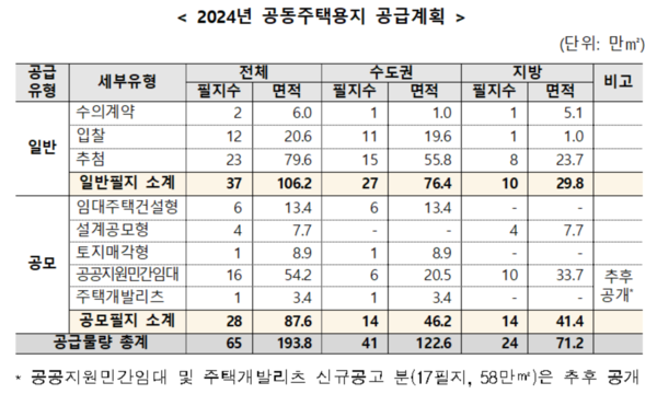 공급유형별로는 추첨·입찰·수의계약 방식이 총 37필지 106만㎡이며, 공모 방식은 임대주택건설형 6필지 13만㎡, 설계공모형 4필지 8만㎡, 토지매각형 1필지, 9만㎡이다. 공공지원민간임대 16필지와 주택개발리츠 1필지는 향후에 별도 공개된다.