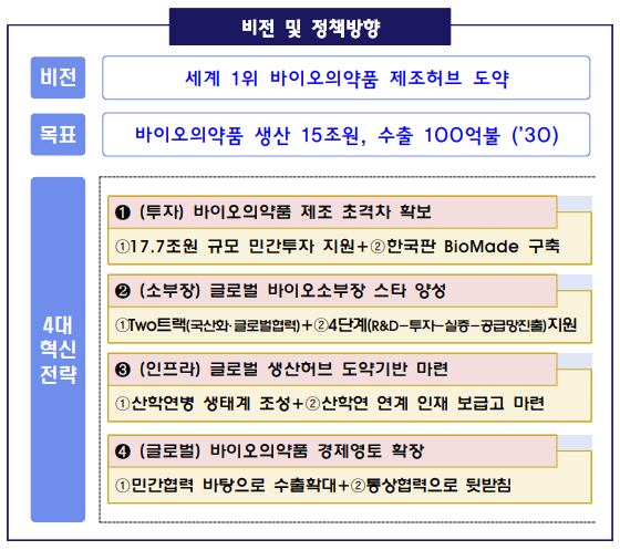 산업부 관계자는 “글로벌 첨단 바이오의약품 위탁개발생산 업체 5개를 육성하고 5대 글로벌 바이오 소재·부품·장비 기업을 배출하겠다”며 “특히 첨단 바이오 생산 공정 고도화를 위한 ‘한국판 바이오메이드(BioMADE·바이오 제조 혁신 플랫폼)’ 사업은 예비타당성 조사를 거쳐 추진할 것”이라고 했다.